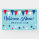 Welcome Home banner sign with colorful bunting flags garland. Add your own text or welcome home text. Cheerful design with elegant typography template. Perfect for welcome home parties, gatherings, reunion, new baby, work and other celebrations. Personalized decorations for festive party.