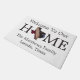 Greet guests with our 'Welcome to Our Home USA Patriotic Texas Map' Doormat, featuring a vintage-style rustic United States flag. Durable and stylish, this doormat is perfect for showcasing your state pride while keeping your entryway clean. A great housewarming gift, this Texan-themed American Flag doormat adds a warm and personal touch to any home. This custom doormat features a typography design with the state of Texas map shape/USA flag in place of the letter O. Personalize with your family's last name monogram and your city name.