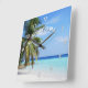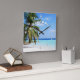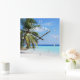 Welcome wall clock with tropical island beach scene. A palm tree grows next to aquamarine blue water. White numbers with black shadows and "welcome" text that curves across the top of this small square clock.