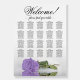 This beautiful 20 table wedding seating chart features a romantic and sophisticated design with a single long-stemmed light purple or lavender colored rose lying on its side reflecting in a pool of water. It has space for 200 guests with 10 seats per table. The fancy script calligraphy title reads "Welcome! please find your table" with space for the names of the couple and wedding date at the bottom. Classy, elegant, stylish, and glam, this board is a great way to welcome your guests while making it easy for them to find their seats.