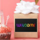 Welcome: a welcoming inclusive message written in rainbow colors. An original take on the rainbow flag!