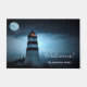 A faint light can be seen in the lighthouse tower. The lighthouse a symbol of hope in the darkest night, guidance and help. With the text: Welcome! Template for a family name, white letters. Use your back-space key to delete if you want the sign without text, name.
