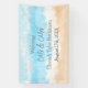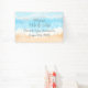 Personalized coastal themed wedding banner with bride and groom names and wedding date and a background of blue ocean waves and sandy beach.