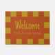 This gold and rust doormat has a checkerboard border. You can edit the text to show a custom message such as Welcome and your name.