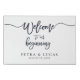 Elegant typography wedding welcome sign, in faux wrapped canvas. Sign features, chic lettering script "Welcome to our beginning" with two template text lines for names and date in navy blue color.