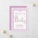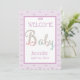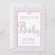 A Welcome New Baby Announcement card designed in soft purple and white with colorful text: BABY, along with the Baby's Name and Birth Date on a white background with purple hearts border. The reverse side includes your Birth Announcement Details, on a soft purple background. To personalize, simply insert the baby's name and other details into our step-by-step template, replacing the sample text. It's fast and easy.