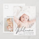 A modern birth announcement postcard. The front features his or her photo overlayed with "Welcome" in a stylish script. Add his or her name, birth date and birth stats. On the back, add an additional picture and personalized message.