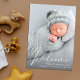 A simple birth announcement featuring your newborn's photo with an overlay of "Welcome" in a stylish white script. Add your baby's name, birth date and birth stats. On the back, add three additional pictures and a personalized message.