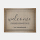 This funny doormat design features the words "Welcome Please Leave By 9". Personalize this cute rustic faux burlap country door mat with your family name and custom greeting. The perfect unique modern housewarming or new homeowners gift.