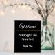 This black foam board has white text that you can edit to display a custom message. (Shown: Welcome Please Sign In and Have a Seat Thank You). An elegant white script forms the top line of display text.