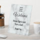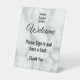 Welcome your visitors with this faux white marble sign featuring your organization's logo. The display text can be edited to show your desired text. Display text reads: Welcome Please sign in and have a seat Thank You