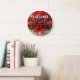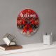 This vibrant clock features the word "Welcome" in sweeping white script over a highly decorative background of red and black layers, sparkling with gold snowflakes and snow effects. A large, luscious red satin bow with gold trim sits prominently at the center, dominating the face. This festive, elegant design is perfect for holiday greetings. The design may look real due to the high detail and three-dimensional texture in the artwork.