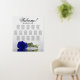 This beautiful 16 table modern floral wedding seating chart features a romantic design with a single long-stemmed royal blue or cobalt colored rose lying on its side reflecting in a pool of water. The title reads: Welcome! Please find your table in elegant script calligraphy. The chart has space for 160 guests with 10 seats per table. There is space for the names of the couple and wedding date below. Wonderful way to add elegance, class, and style to your wedding reception, while helping your guests to find their seats.
