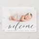 A sweet and elegant birth announcement design featuring a full bleed horizontal or landscape oriented photo with "welcome" overlaid in chic calligraphy script lettering. Your baby's name and birth stats appear beneath. Add three additional square photos to the back, along with a personal message.