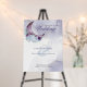 Elegant Wedding Welcome Sign - Stunning Amethyst Purple crescent moon pale dusty blue and plum purple flowers with pale sage eucalyptus foliage accents highlighted by a pale lilac and gold watercolor wash background - Design by theBarefootBride ™.