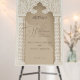 Usher your guests into your Nikah ceremony with this majestic welcome sign, adorned with the elegance of Islamic architecture. It features a golden arch that beautifully frames the welcoming script, while intricate arabesque patterns cascade down the sides, complemented by chevron columns. The design's color palette of gold, cream, and ivory sets a luxurious tone, as the card reflects the light, creating a shimmering effect that captures the essence of your special day. Perfect for greeting guests at the venue entrance, this sign is not only a guide but a piece of art that enhances the celebratory atmosphere.