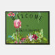 Tropical fantasy of flowers, foliage, and flamingo in watercolors against jungle green ground. Customize your welcome. Primarily warm pinks and tropic greens.