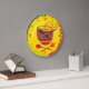 Colorful loose Mexican or southwest native patterns on this kitchen clock featuring a steaming bowl with utensils and cheerful message of welcome to my kitchen in Spanish.