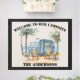 This rug isn't your average doormat. It's a spacious hangout zone for you and your fellow campers. Picture it: a vibrant design featuring the words "Welcome to Our Campsite" nestled above a picture of a cozy camper parked beside sparkling lake water, with inviting chairs set out for relaxation.