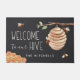 Welcome guests with this cute bee themed doormat featuring watercolor illustrations of honeybees, honeycomb and a hive, with "welcome to our hive" in ivory lettering. Personalize with your family name along the bottom.