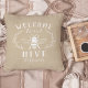 Welcome guests with this cute bee themed throw pillow featuring a vintage style honeybee illustration adorned with botanical leaf detailing on a soft tan background. "Welcome to our hive" appears in white lettering. Personalize with your family name along the bottom.