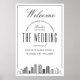 It features a large welcome greeting towards the top and a stylized illustration of the city's unique skyline resting towards the bottom. In between this sits your wedding day information, including the date, city, and the names of the lovely to-be married couple.