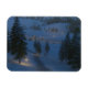 In this fantasy-like scene on a winter night, an icy path leads between snowdrifts down the hill and over the river to a welcoming cottage with candles in the window. The trail and stepstones across the water are lit by warmly glowing lanterns, and a bonfire beside the path sends sparks into the cold night air.