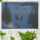 In this fantasy-like scene on a winter night, an icy path leads between snowdrifts down the hill and over the river to a welcoming cottage with candles in the window. The trail and stepstones across the water are lit by warmly glowing lanterns, and a bonfire beside the path sends sparks into the cold night air.