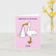 A simple cartoon of a stork holding a baby girl in a white sheet which hangs from it's beak. The image is set against a pale pink colored background and accompanied by the words 'Welcome to the family Niece'.