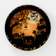 Orange and black Halloween scene illustration incorporating a silhouette of a church graveyard with gravestones, bats flying out of the belfry against a ghostly moon, a black cat on the roof and a spider and web hanging from a bare tree. Customize with your own text and font as a treat for yourself or a valued family member to make them feel special. Great for autumn and Halloween season.
