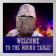 Closeup view of a helmet and an plate armor of a medieval knight against the colorful background which imitates the outer space or a battlefield to your liking. Text - Welcome to the round table - added