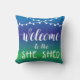 Welcome to the She Shed with party string lights on blue and green ombré background with fun typography.