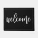 This doormat features the word "welcome" in a modern handwritten white script with a white outline around it. Background color can be changed by selecting a color from the palette using the customization tool or you can input your own hex code.