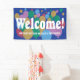 Welcome banner with a colorful floating balloons background and the word Welcome in white. Add more text on the line below or delete that text field if not needed.