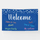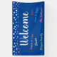 Welcome banner with six names in fully customizable text (or add more if you like). Confetti circles and stars at the top. Change the blue background to another color if you like. Welcome a group of visitors or guests with a fun banner.
