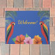 Welcome with tropical parrots and hibiscus flowers doormat