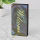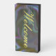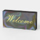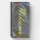 Wood block sign with the word "Welcome" on a colourful background. The sign is completely customisable.