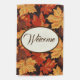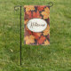 This yard flag is shown in the outdoor style with a lovely fall leaves print.
