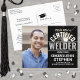 Share the joy of a welding school graduation and invite family and friends to celebrate with custom photo "Certified Welder" announcements. The picture and all wording on this template are simple to personalize with any details of your choice, including graduate name, class year, party invitation info, welder certification, degree title, favorite inspirational quote or plans for the future. The black and white design features a welding torch with sparks, a faux stainless steel mortar board, modern bold typography, and one photo of your choice. Please note that silver graduation cap is printed color, not metallic foil. These stylish graduation announcement cards are an elegant way to share a special day celebration with family and friends. Congratulations to the graduate!