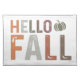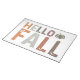This fall-themed design warmly welcomes the autumn season with the phrase "Hello Fall." The words are arranged in a simple yet visually appealing layout, with "Hello" placed above "Fall." Each letter in the phrase is presented in a bold, blocky font with a slightly distressed texture, giving it a rustic, weathered look that complements the autumnal theme.