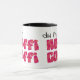 An attractive white ringer mug with a Black Lip and Handle and 'I like coffee' in the Welsh language'. The letters are filled with a Bright Pink and Brilliant Orange pattern.