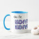 An attractive white ringer mug with a Powder Blue Lip and Handle and 'I like coffee' in the Welsh language'. The letters are filled with a purple. blue and silver-effect geometric pattern. You may prefer to change the background colour by using the Customize button and then the Edit > Background button.