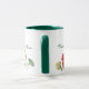 A chic White Coffee Mug to personalize, with a Hunter Green Lip and Handle and a row of Welsh Emblems, a girl in welsh traditional dress, a red dragon, a bunch of leeks, a harp and a bunch of daffodils.