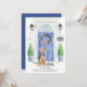 Announce your new address with our stylish announcement featuring a Welsh Terrier, blue front door, welcome mat, slate sign, topiaries and a floral wreath set on a gray brick background.