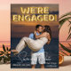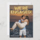 This Save the Date for the wedding announcement features a fun and romantic design. A sample engagement photograph covers the background, which you can replace with your own custom photo or other image of your choice. The phrase, "we're engaged" is printed in gold foil balloons across the top portion. The Save our Date location and day are printed at the bottom in an elegant white font, with extra text printed on the back of the announcement.