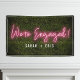 Pink neon sign inspired "We're Engaged" heart design over boxwood inspired background with custom white text for bride and groom's names.