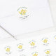 Gender neutral pregnancy announcement stickers to use as envelope seals, favor labels etc. These sweet little stickers let everyone know you're pregnant. The design features a watercolor illustration of a yellow teapot with yellow flowers. The wording reads "A baby is brewing" in bold green lettering, curved around the teapot. The template is set up ready for you to personalize the message, which is printed at the bottom in neat script typography. The sample wording currently reads "[name] and [name] are expecting!"