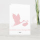 A pregnancy announcement card with silhouette of flying stork in white against a soft pink background.