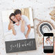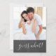 Upload your pregnancy announcement photo to this chalkboard announcement card. The design features a gender neutral, chalkboard with white hand lettered typography. It reads guess what! on the front and "we're expecting" on the back. The wording template is set up for you to add your personalized message with your baby due date and sign off with your name(s).