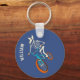 This keychain features my hand drawn illustration of a werewolf skeleton riding a BMX bike. The comic book style graphic is in ivory, aqua blue and orange against a darker blue background. There's a spot to add your name or other custom text. Also works great as a backpack tag. The reverse side has a coordinating blue on blue checkerboard design.